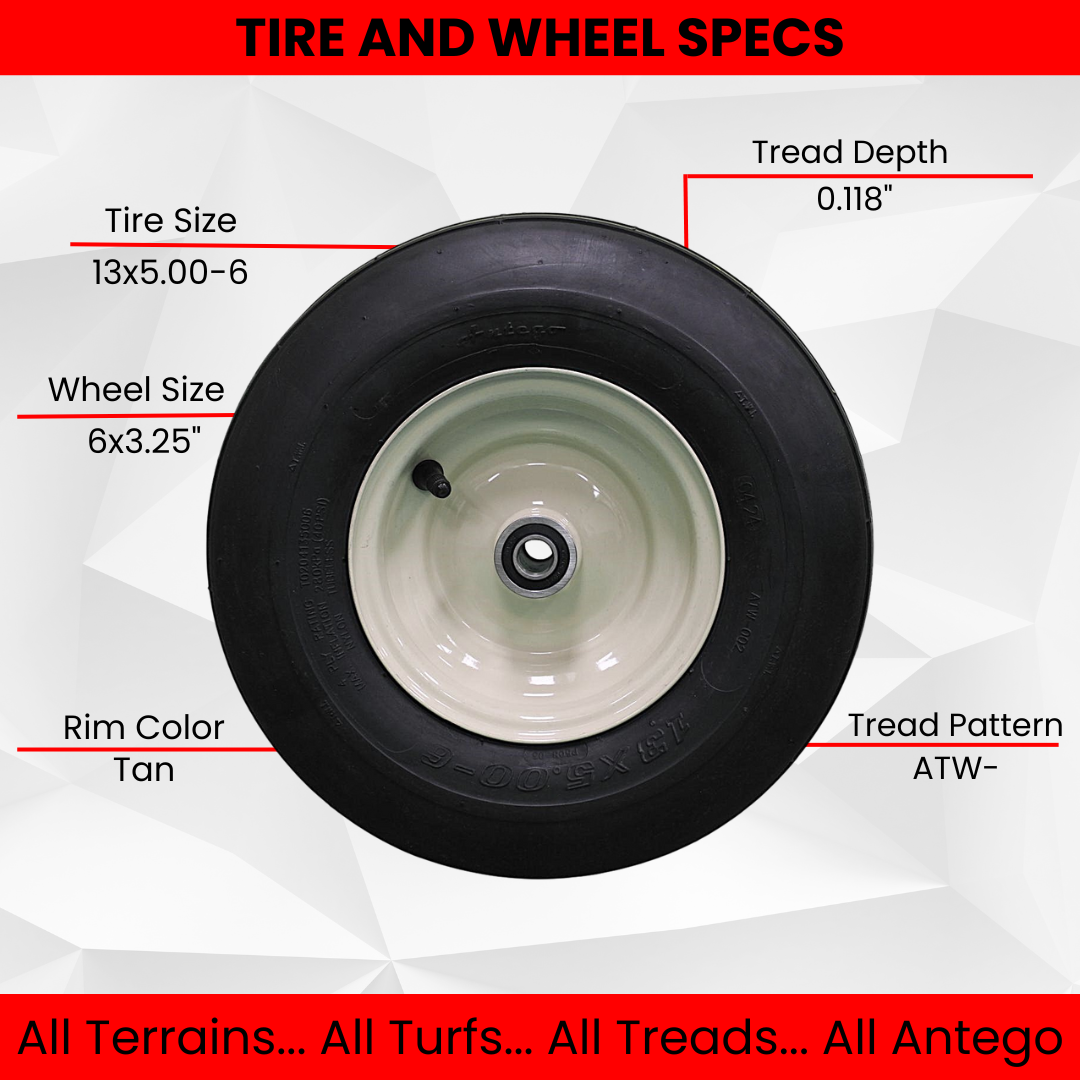Introducing the (Set of 4) Grasshopper Pneumatic 13x5.00-6 Tan Assemblies – your ultimate tire and wheel combo! Ready to replace tired old parts, these tubeless ribbed tires offer a durability you can trust. With an impressive max load of 440 lbs., feel confident on any terrain with their superior grip at a PSI of 40. Made from high-quality materials, these ply 4 tires ensure long-lasting performance. But it doesn't stop there - our wheels are equally impressive. Sized at 6x3.25, they perfectly complement the tires while adding a touch of elegance in our signature Grasshopper Tan hue. The sturdy hub length of 3.73" guarantees stability during every ride. Crafted for perfection, our assemblies feature .629" precision ball bearings that glide effortlessly across any surface for smooth operation and reduced friction. Don't miss out on this unbeatable combo that exceeds expectations in both style and functionality! Upgrade your equipment today by clicking the "Add to Cart" button and experience the difference firsthand