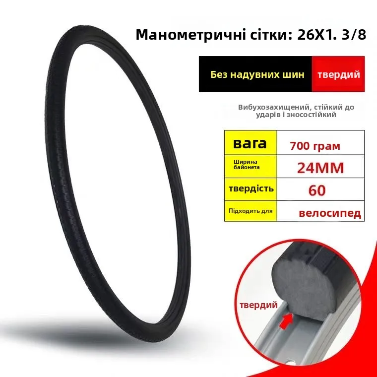 This 26-inch solid tire is designed for easy maintenance and durability, eliminating the need for frequent inflation.