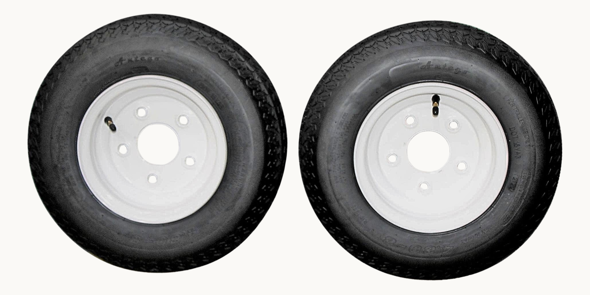 Upgrade your trailer's performance and safety with our Antego Tire and Wheel Trailer Tires. This pair of 4.80-8 (480-8) trailer tires comes pre-mounted on 8" white rims, boasting a Load Range C and 6 Ply rating (6PR) for enhanced durability and reliability. Perfect for 4.8-8 trailer tire needs; these reliable trailer tires 4.80-8 are designed for optimal performance, ensuring smooth towing for your boat trailer wheels or log splitter tires and wheels 4.80-8, with a sturdy 5 lug configuration that guarantees compatibility with various boat trailer wheels and tires, making them the ideal choice for your next adventure! Ideal for a wide range of trailers, these tires and wheels are designed to meet the rigorous demands of road travel, ensuring your cargo stays secure from point A to point B. Refer to your existing tire sidewall and/or trailer owner's manual to determine the appropriate tire size and load capacity for your application.