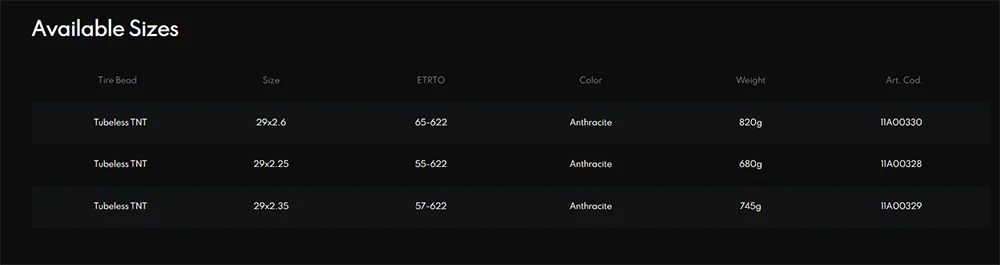- Manufacturer reference: 11A.00.328 (29x2.25), 11A.00.3289 (29x2.35), 11A.00.330 (29x2.60)