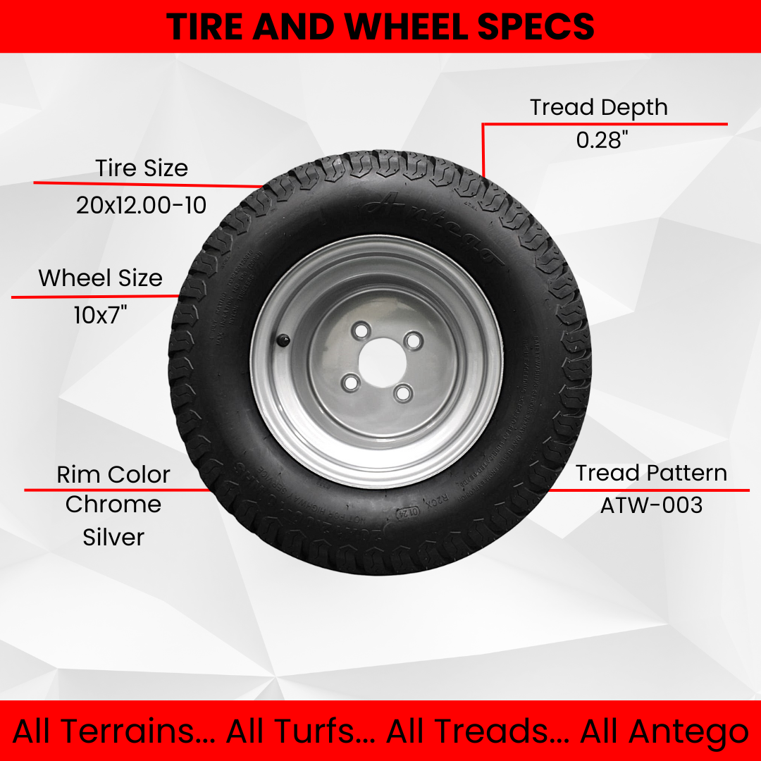 But the true game-changer is the remarkable tire that accompanies it: an impressive 20x12.00-10 dimension with a striking OD of 20", guaranteeing utmost stability and performance. Its generous tread depth of .314" grants you unrivaled control over any terrain you dare to conquer.